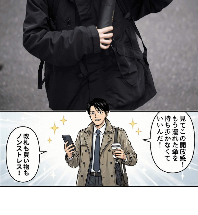 逆折り構造により、閉じたときに濡れた面が内側へなる設計を採用しています。満員電車・バス・店内などでも、衣服や隣の人を濡らしにくい構造で、雨の日の移動ストレスを減らします。