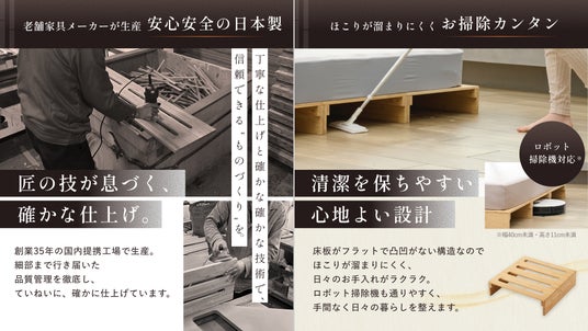 長年家具づくりに携わってきた国内工場の確かな技術は、毎日の使いやすさにも表れています。素材選定から検品まで徹底管理された「日本品質」が安心感を担保すると同時に、日々の家事負担も軽減。凹凸の少ないフラットな床板はホコリが溜まりにくく、ベッド下にはロボット掃除機が走行できる空間を確保しました。「見えない部分」にまで妥協しない丁寧なものづくりが、清潔で快適な寝室環境を長く支え続けます。