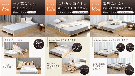 複数のパレットを組み合わせることで、シングルからクイーン、キングサイズまで自由にサイズ調整が可能です。引っ越しによる間取りの変化や、家族構成の変化(結婚、出産、子供の独立など)があっても、レイアウトを変更しながら長く使い続けることができます。