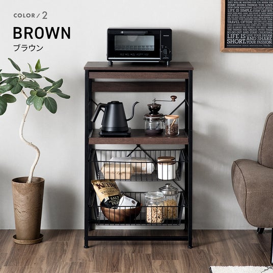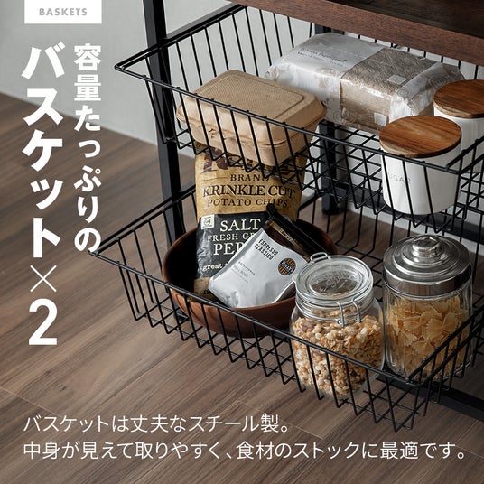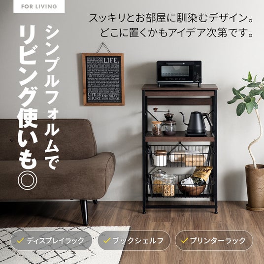 スライド棚×2・バスケット×2の収納力と耐荷重最大20kg、錆対策のパウダーコーティングや汚れ対策のメラニン化粧板など、多機能かつコンパクトなレンジラックをご紹介いたします。