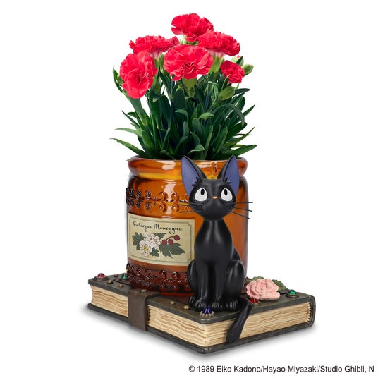 セット内容:魔女の宅急便 『コキリの魔法』(サイズ:約W140×H120×D175mm)、カーネーション~プリティ(R)いちご~<生花・3号鉢>、お花の育て方カード、魔女の宅急便 オリジナルメッセージカード