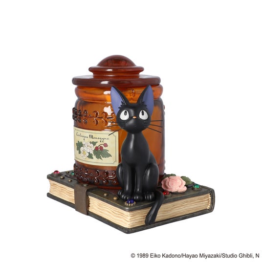 『コキリの魔法』という商品名の通り、キキの母・コキリが魔法薬に使う材料の詰まった大きな瓶をイメージしたジオラマボックスと生花のカーネーションのセットです。瓶に敷かれた古く厚い魔法の本の表紙には、宝石のようなガラス細工をあしらい、近くで視線を送るジジの姿は、まるでコキリの薬の調合を見守っているかのようです。カーネーションをお楽しみいただいた後は、瓶の蓋をしてインテリアとしてご使用いただけます。