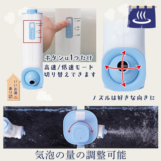 パワフルな「高速モード」とリラックス用の「低速モード」の2種類を搭載し、バブルの量や水流の向きも自由に調整可能。