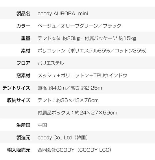 合同会社COODY(所在地:東京都)は、クラウドファンディングサイト「Makuake」にて多大なるご支援をいただいたcoodyエアテントAurora Miniを、公式サイトにて一般販売開始いたしました。
