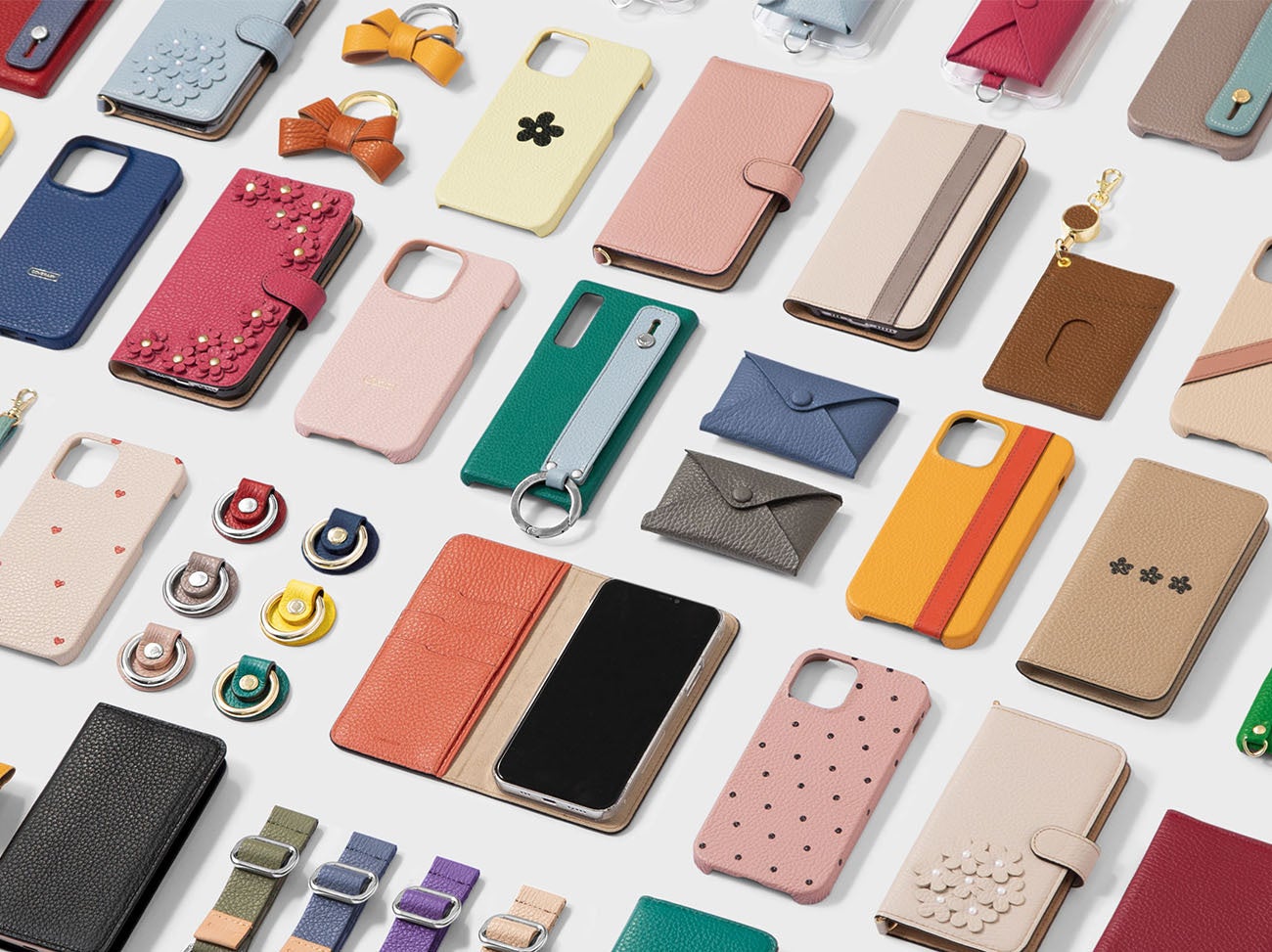 主要な機種はもちろん、古い機種やニッチな機種など、すべての機種に対応したカバーの製作が可能です。背面カバー型に加え、手帳型やショルダー型など人気の高い形を揃えています。