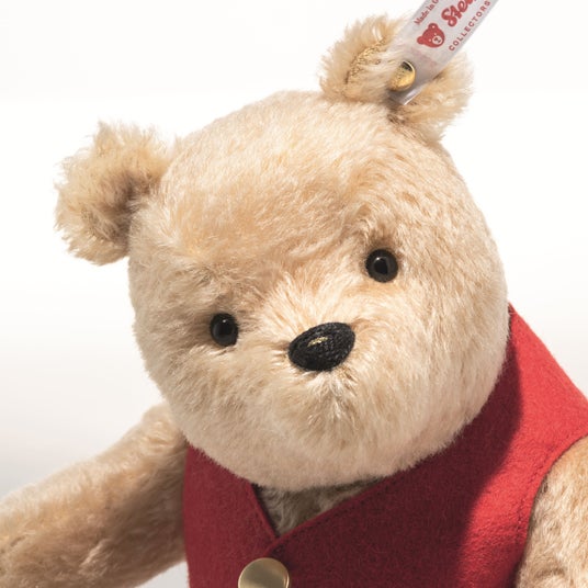 この度発売するシュタイフの「ディズニー くまのプーさん 100周年記念」は、座高20センチのぬいぐるみで、首と両腕がジョイントで動かすことができます。