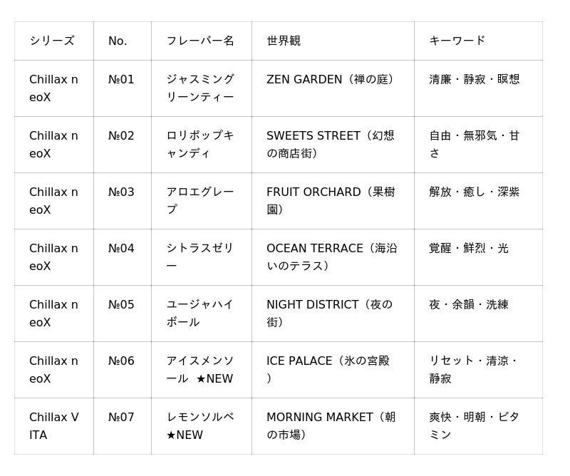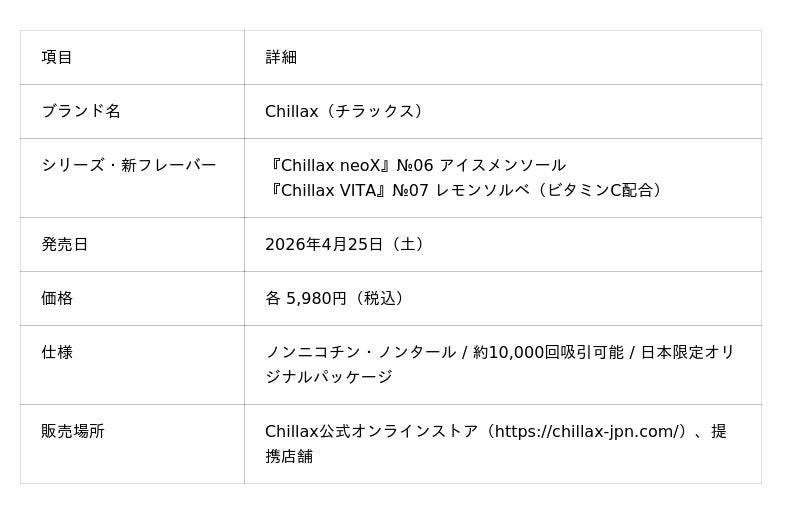 「アイスメンソール」は既存の『Chillax neoX(チラックス ネオエックス)』シリーズに追加され、「レモンソルベ」はビタミンCを配合した新シリーズ『Chillax VITA(チラックス ビタ)』の第1弾として展開します。