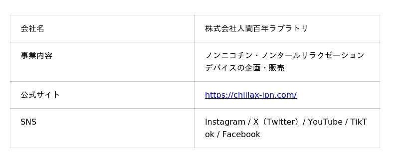 株式会社人間百年ラブラトリ(所在地:東京都台東区、代表取締役:宮澤聖市)は、ノンニコチン・ノンタールのリラクゼーションブランド『Chillax(チラックス)』の新フレーバーとして、「アイスメンソール」および「レモンソルベ」を、2026年4月25日(土)より公式オンラインストア等にて発売開始いたします。