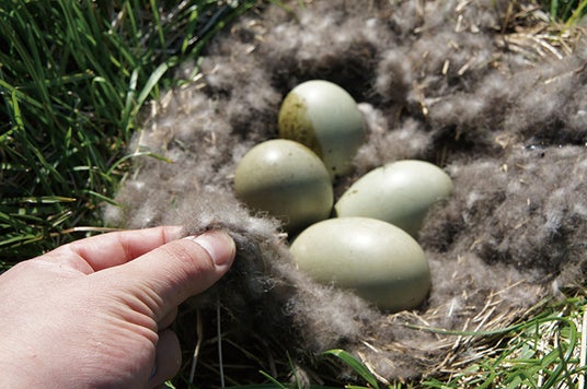 アイダーダックは、アイスランドの極寒の地に生息する野生のカモ。国際保護鳥に指定され、厳格に保護されています。人が直接関与できないため、羽毛の採取は母鳥の習性を生かした方法で行われます。